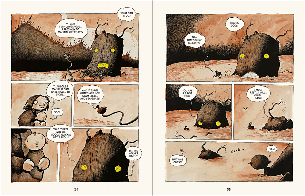 I loved the art on this one, too—like a blend of Maurice Sendak and Edward Gorey, with monsters that are scary-cute like in Where the Wild Things Are. On our judging panel, there were mixed feelings about the rather monochromatic color scheme, which is understandable–this one isn’t colorfully inked like many GNs for young readers. But I liked the spare use of color; it worked for me and gave it a sort of moodiness that I think will appeal to a broader age range.